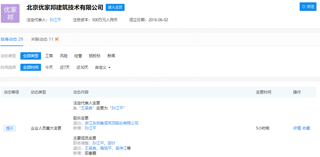 乐居财经 彦杰 3月21日消息,浙江友邦集成吊顶股份有限公司(以下简称:友邦吊顶)转让北京优家邦建筑技术有限公司(以下简称:优家邦建筑)65%股份予孙江平 企查查显示,优家邦建筑成立于2016年6月2日,法定代表人为孙江平,注册资本为500万元人民币。