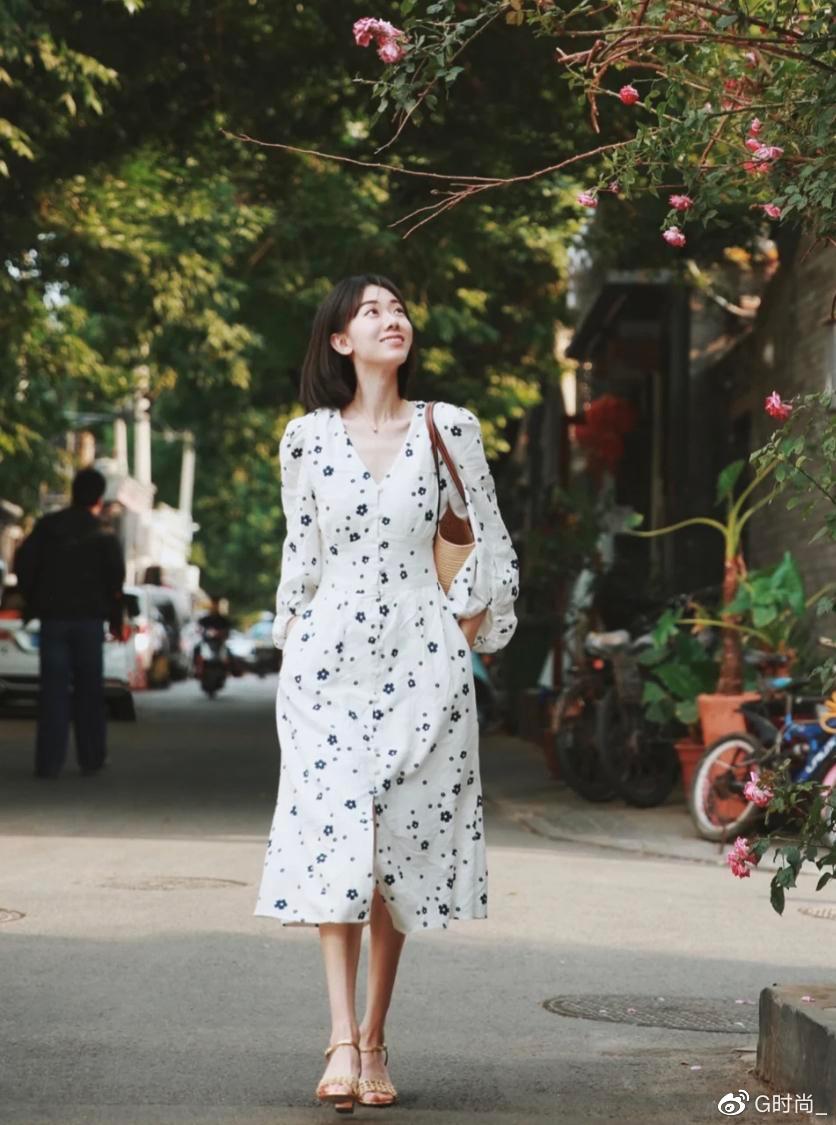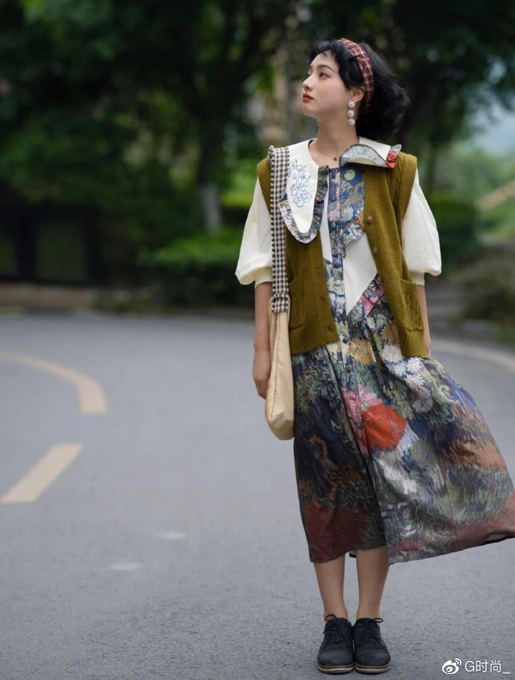 高级阶段——叠穿带来的风格碰撞高级感的连衣裙穿搭,就比较考验品味和审美能力了,比起基础款式的搭配,高级阶段讲究碰撞感和呼应效果。1.碎花裙和印花马甲