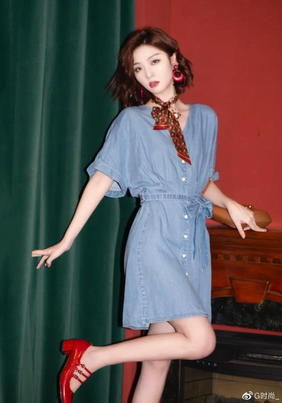 除了单品之间的叠穿,服装和配饰的风格碰撞,也是让造型更显高级美的关键,牛仔面料的连衣裙材质硬挺,塑形效果十足,能够很好的达到扬长避短的效果,尤其是带有腰带加持的V龄短裙,活力气质满满,叠搭红色印花丝巾,复古摩登范儿显得格外惊艳。