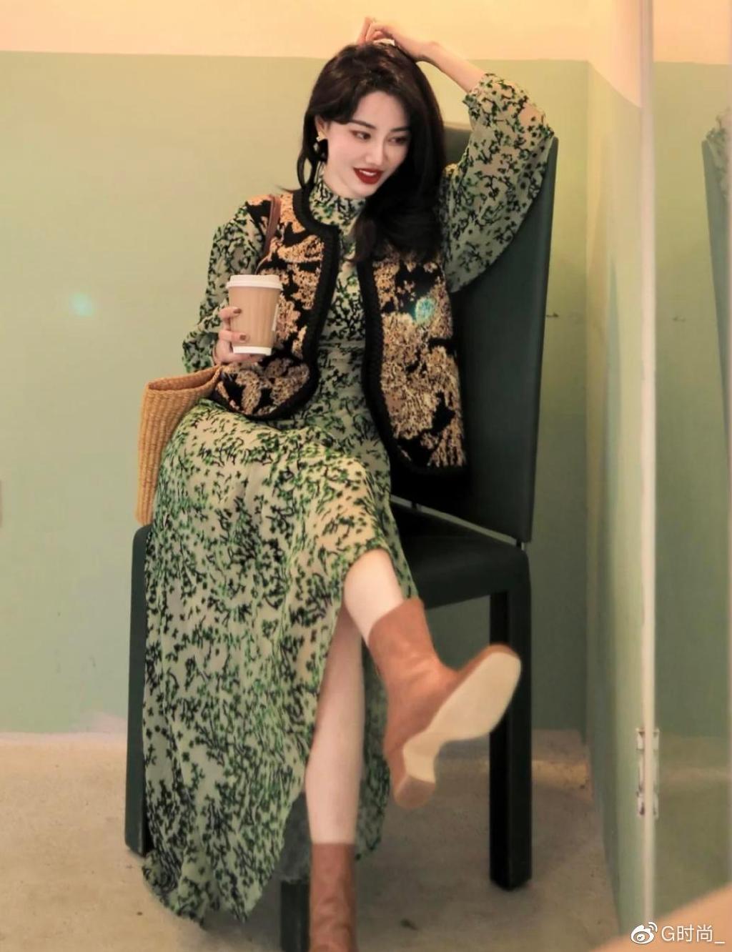 两种印花元素的单品互相搭配,就要拿捏住二者之间的优势互补,二件单品太夸张不可取,太素雅也不可取,反差感太强也不行,这也就是高级阶段的困难之处墨绿色碎花裙叠穿黑色金丝勾勒的刺绣马甲,复古气息扑面而来,色彩的碰撞和元素的运用,都是让造型更高级的处理手法,在搭配一双棕色短靴,就能呼应整体造型。