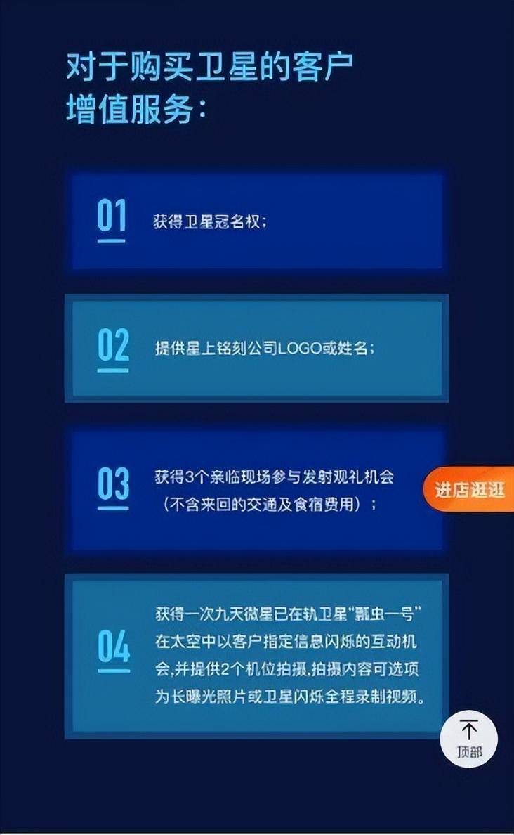 具体来说,购买卫星后并不能真正获得对应卫星的所有权,只是获得包括冠名卫星、在卫星上刻字(姓名或公司LOGO)、现场观看卫星发射(不含交通住宿费)、以客户需要信息为基础的卫星闪烁、个性化拍照等增值服务