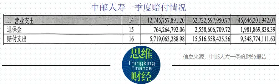 另外,在退保金方面,中邮人寿一季度退保金额为25.59亿元,比上年同期增加了5.77亿元同时,公司今年一季度赔付支出大幅增长,一季度赔付支出金额为155.17亿元,比上年同期增加了61.68亿元,同比增长65.97%。