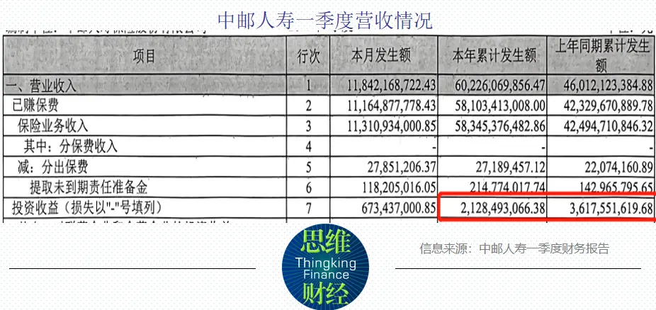 根据今年一季度超4400亿元的投资资产,对应减少约20亿元的投资资产,因此导致一季度净利润大幅减少这一点从中邮人寿一季度的财务报表中也可以看出,公司今年一季度投资收益为21.28亿元,比上年同期减少了14.9亿元,同比下降41.18%。