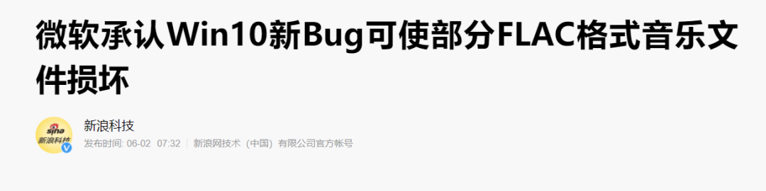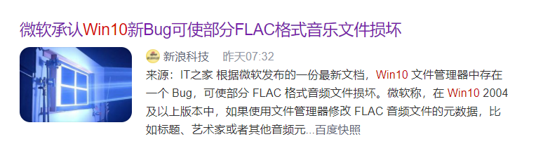 win 10 的更新经常出现BUG,大家都知道吧?许多新BUG总是会伴随着新功能,如约跟我们见面很多时候,BUG总是比新功能来的更加惊喜一点就像最近的这个新BUG,严重到会使部分 FLAC 格式音频文件损坏。