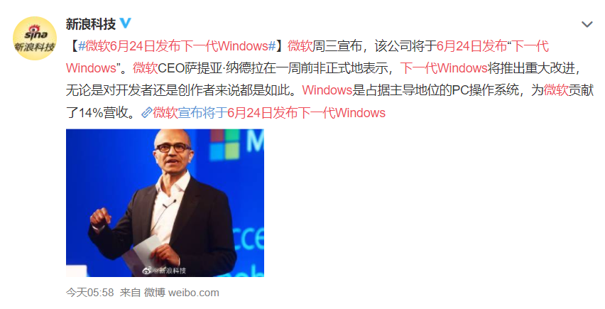 果不其然6 月 3 日凌晨,微软宣布将于 6 月 24 日发布下一代 Windows届时微软CEO纳德拉和首席产品官Panos Panay将会主持这场发布会这不,官方实锤,下一代 Windows 妥妥的。