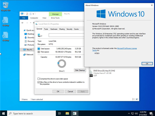 对此有所了解的小伙伴应该都知道,原本 Win10 21H2 LTSC 系统就已经是官方精简版,而 tiny10版则对官方精简版进行了进一步地精简改进之后,最终 tiny10 21H2 的安装容量缩小到了只有1.43GB 的大小,安装之后占用空间也只有3.25GB。