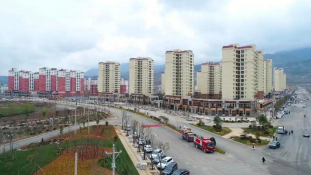 图为云南省昭通市昭阳区靖安易地扶贫搬迁安置区一角在昭通中心城区平坦地段,当地政府兴建了靖安、卯家湾两个大型跨县区安置区,合计可安置7万余人,其规模相当于两个中等县城同年,总投资150亿元、占地面积达218公顷的会泽新城亦建成并投入使用。