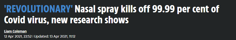 “我们如果能够在去年就推出市场,就会拯救很多生命”日前,以色列当局已批准这款药品上市,而且大概会在一个月后以30美刀/瓶的价格在药房柜台销售https://www.thesun.co.uk/news/14630269/nasal-spray-kills-off-covid/。