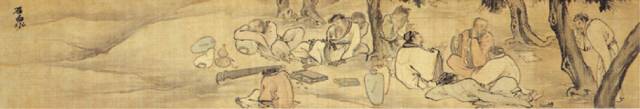 (【明】万邦治 《醉饮图》)除了魏晋,文人墨客不好拘束,追求“行为”艺术也是代代相通的在明代画家万邦治根据杜甫的《饮中八仙歌》创作的《醉饮图》中,画中的八位醉汉有贺知章、李适之、李白、崔宗之、苏晋等,这些当时的名流大家饮酒作乐,醉卧林间,颇有一种“斗酒十千恣欢谑,但愿长醉不复醒”的意境。