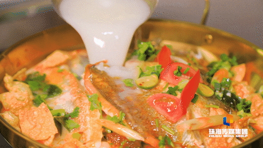 这是飞哥自创的招牌菜,灵感来源于四川烤鱼。鲈鱼用的是斗门白蕉海鲈,通过铁板煎制锁住水分,鱼皮焦香,肉质细嫩,再将鱼倒入冬阴功汤一起煮,越煮越鲜甜。