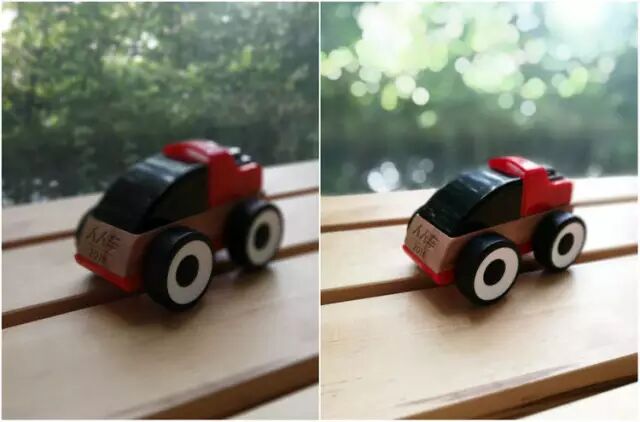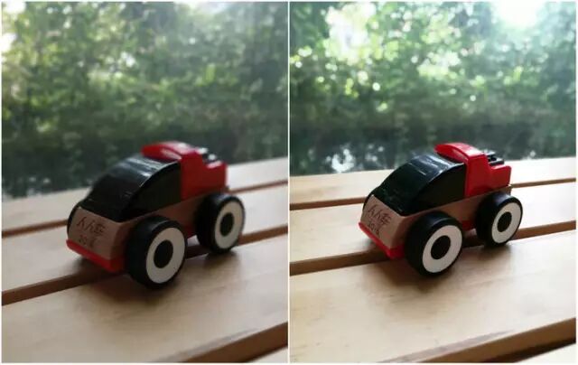 由左至右分别由红米 Pro 和华为 P9 拍摄(f/0.95)这组样张中,我们直接把两部手机的模拟光圈开到最大的 f/0.95,焦点都对在「人人车」这几个字上可以看出,红米 Pro「虚」得有些过了,小车有一半都给虚掉了,华为 P9 的边缘虚化也不太自然,但基本保留了小车的轮廓,比红米 Pro 略好点。