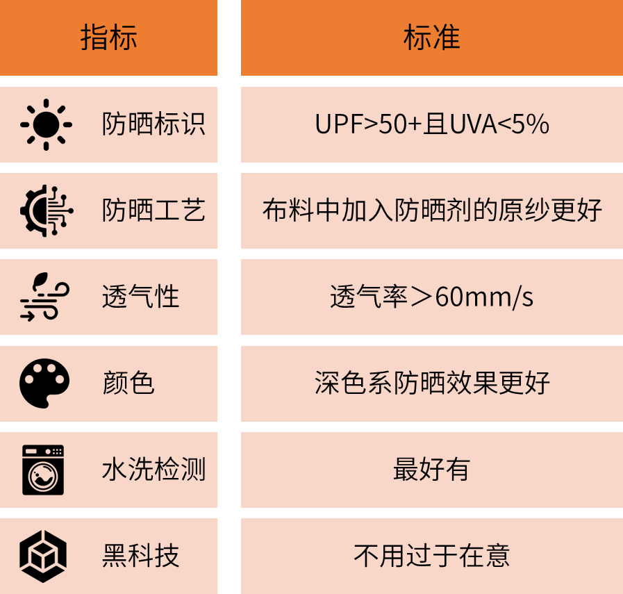 UPF(紫外线防护系数)>40 且 UVA (长波紫外线)平均透射比<5%。UPF 值越高,同时 UVA 平均透射比越低,防晒衣的防护效果越好。