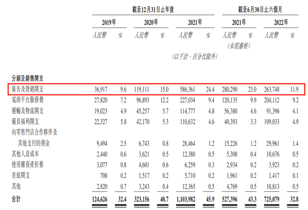 又要全平台推广(小红书、微博、微信都覆盖),又要请明星代言(今年签约周杰伦代言),导致广告开支增速快(近三年年化增长率近200%)、占比高(21年营销占比接近收入一半)。