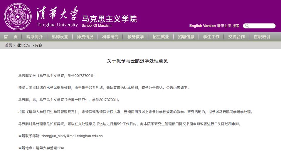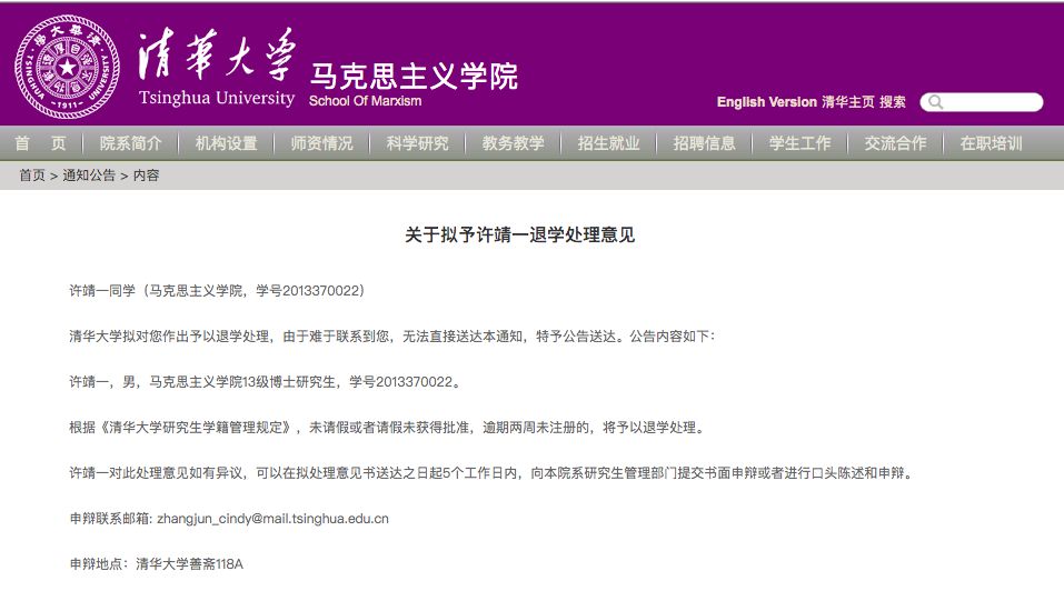 编者按:近日,清华大学拟对两名博士研究生作退学处理此前,不少高校对多批大学生作出退学处理!全文共1666字,阅读大约需要4分近日,清华大学马克思主义学院发布两份通知公告:《关于拟予马XX退学处理意见》和《关于拟予许XX退学处理意见》。