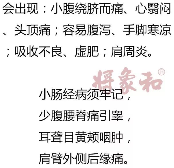 曰:『小肠者,受盛之官,化物出焉。』小肠经主要对营养和糟粕进行整理和分送,把营养物输送给脾,再把脏东西分成液体和渣滓,分送到膀胱和大肠。小肠经不通: