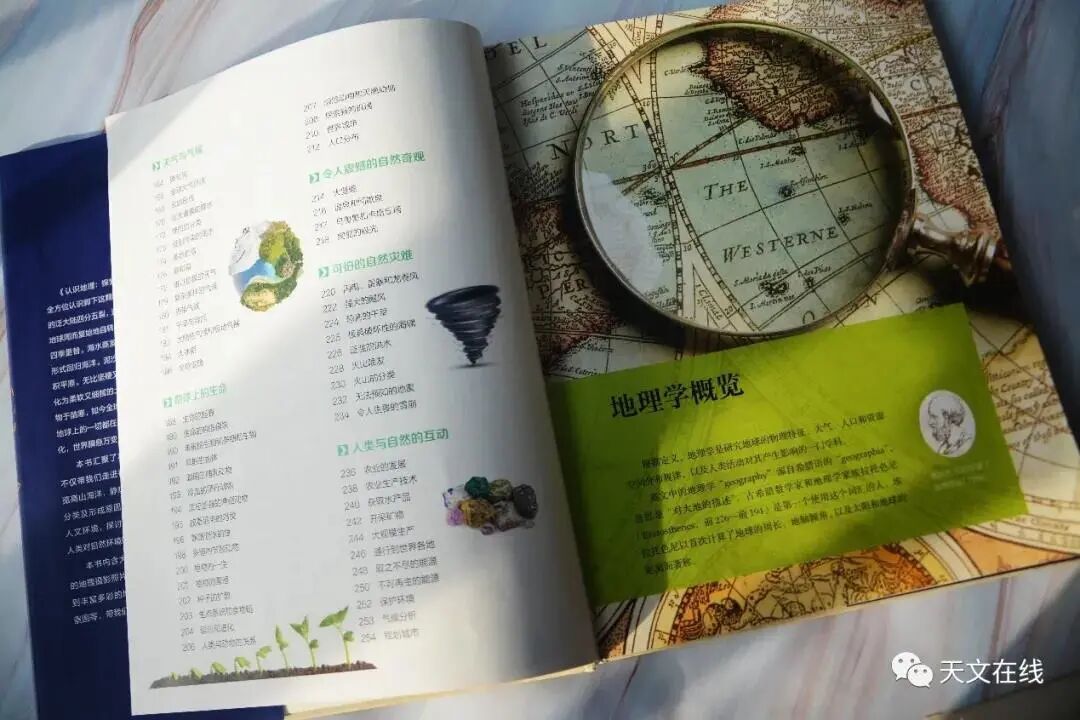 我们再来看看《认识地理:探索变化的世界》的目录这本书先回顾了地理学的发展历程,接着以宏观视角,概述了宇宙的诞生、太阳系,直到地球,然后再重点讲述地球的大陆、岩石与矿物、地貌、植物、水体、大气、气候、生命,自然奇观与灾难,还特别专门有一章讲述人与自然的互动,其中也聚焦当下最关注的新能源问题。