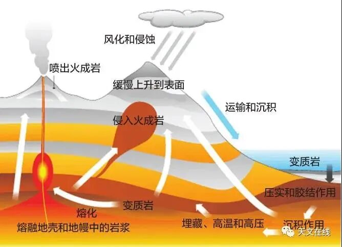 不仅是水是一个不断循环的系统,拉长时间,地球上的岩石也是如此。地球上的岩石大致可分为三大类,即火成岩、沉积岩和变质岩。它们在各种力量的作用下,也是可以相互转化的,这也就形成了地壳物质的循环。