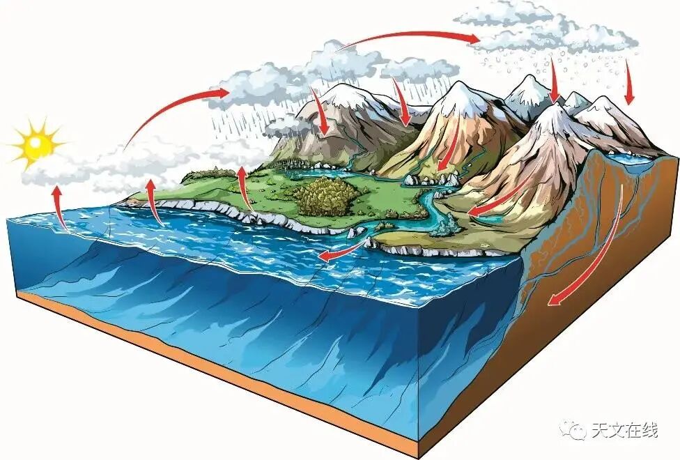 水圈中的水处于一种不断运动的状态。大气中的水以雨或雪等的形式降落到地球表面。在太阳热量的作用下,这些水蒸发成水汽,再次返回大气。水汽又在空中发生凝结,形成云,并再次以降水的形式回到地表。如此循环。