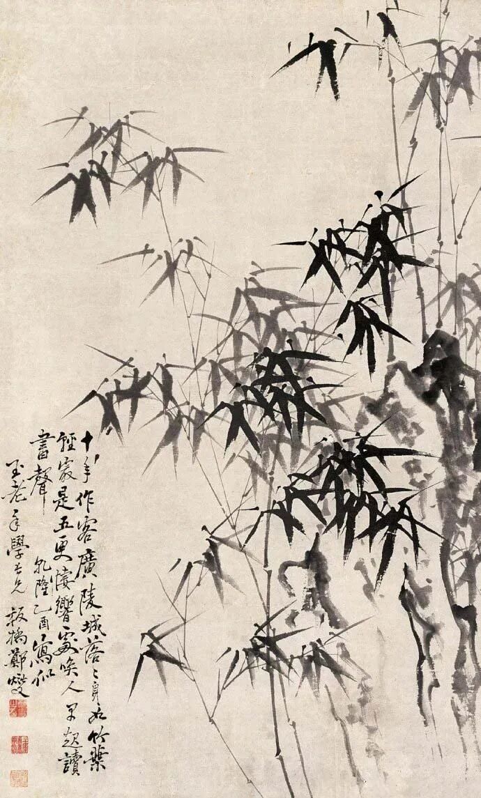 如他所说:“凡我画的竹,没有什么老师传授,大多从纸窗、洁白的墙壁和日光月影映照出的竹影中学得的”画竹,根根叶叶如实描摹难免流于死板影的妙处就在于:褪去了竹的色彩,简化了竹的线条,形在虚实之间,色在浓淡之间。