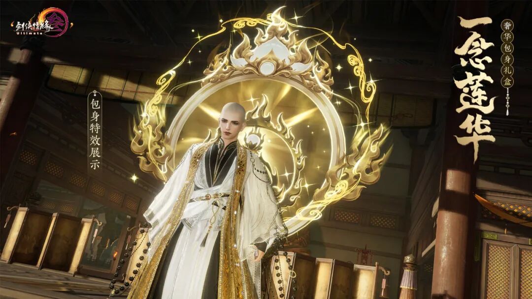 -郁郁檀香,佛光万丈,侠士还可解锁礼盒专属包身特效体验!-开启后背后光点外散八方,忽展为一尊镶金玉璧,外圈云纹光轮缓缓旋动,菩提金叶飘散漾动华彩,却如鎏金业火熊熊中烧,光芒映照,天佛涅槃。