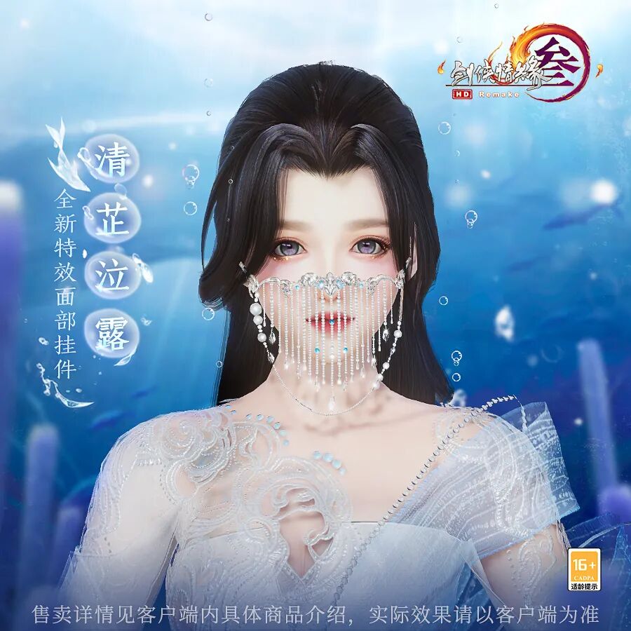 -芙蓉不及美人妆--精妙无双珠钻光--全新特效面部挂件“清芷泣露”闪耀登场,以精密细银打造,珠链微垂晶钻缀尾,两颊之侧更有泡泡特效。-光华璀璨四溢,仿佛天山冰雪自赏孤芳,欲遮而半掩面,衬得绝世容颜。