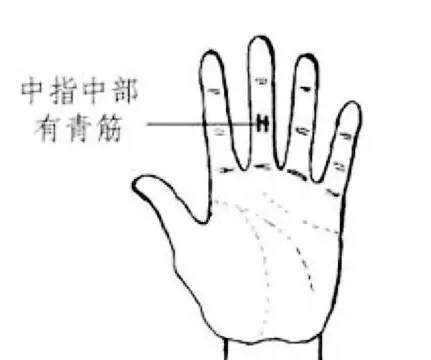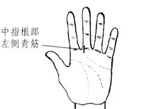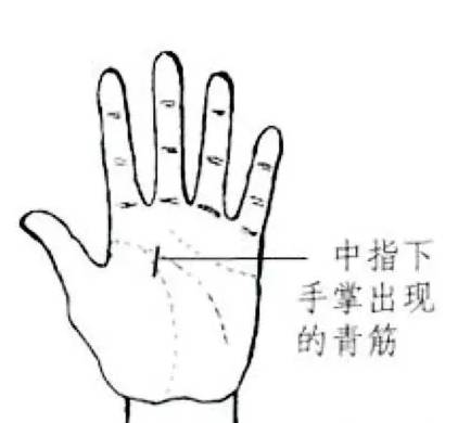 代表先天肾气不足。而且腰腿没劲、酸软。同样是青筋越长、越深,病情就越重。中指下手掌有青筋