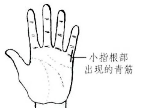代表常常头痛、头晕。大拇指的外侧也有青筋,说明从小就患有头痛、头晕,多数都是先天不足造成脑部供血少引起的。中指根部有青筋