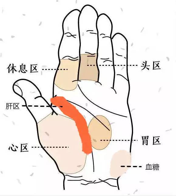 手诊区位1、心区:心脏疾病的“位”在手掌大鱼际处2、头区:主要针对脑血管疾病的判别区域,在中指近手掌一侧的整个指节3、胃区:肠胃疾病的手诊部位,位于掌心4、肝区:位于生命线与大鱼际之间条索状区域的上三分之二部分。