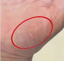 代表脑动脉硬化如果只是出在左侧(如图),表示左侧脑动脉硬化及经络不通较严重,头部左侧容易出现不适;道家绳疗提示如果出现在右侧,说明右侧脑动脉硬化及经络不通比较严重,头部右侧容易出现不适;小指外侧出现青筋。